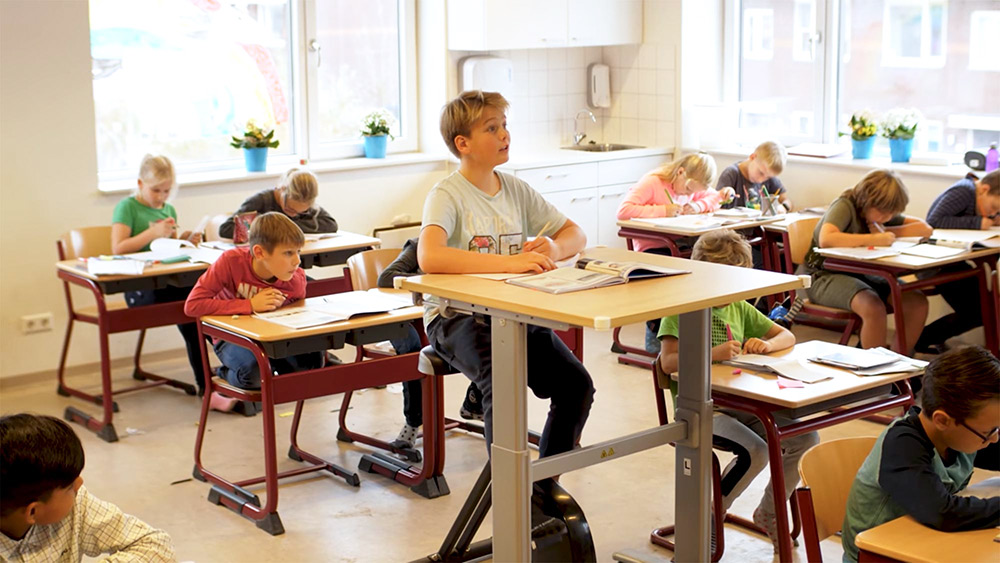 Das Worktivity Deskbike in Kombination mit einem höhenverstellbaren Tisch bietet ideale Voraussetzungen für den Einsatz im Unterricht. Es ist mit einer höhenverstellbaren Sattelstange ausgestattet und kann so auf die verschiedenen Größen der Kinder angepasst werden. Der Transport erfolgt problemlos über Rollen, so können Schüler bei Projektarbeit auch an 2 Seiten des Tisches arbeiten. Informationen über verbrauchte Kalorien, zurückgelegte Kilometer und Nutzungsdauer können auf das Handy des Lehrers geladen werden oder über ein wireless Display zur Verfügung gestellt werden.